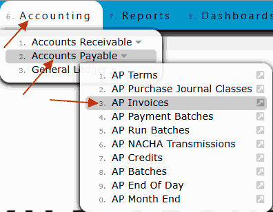 1. Go to the Accounting Menu, hover or click on the Accounts Payable Sub-Menu, then click on the AP Run Batches Sub-Menu.
